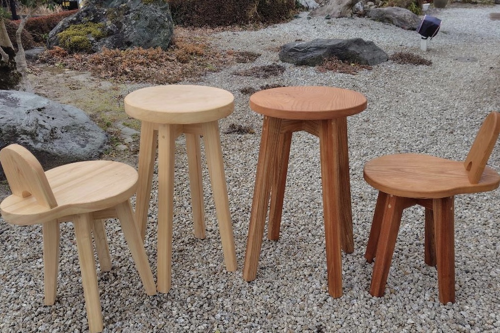 自然木の椅子、ベンチ、まな板など